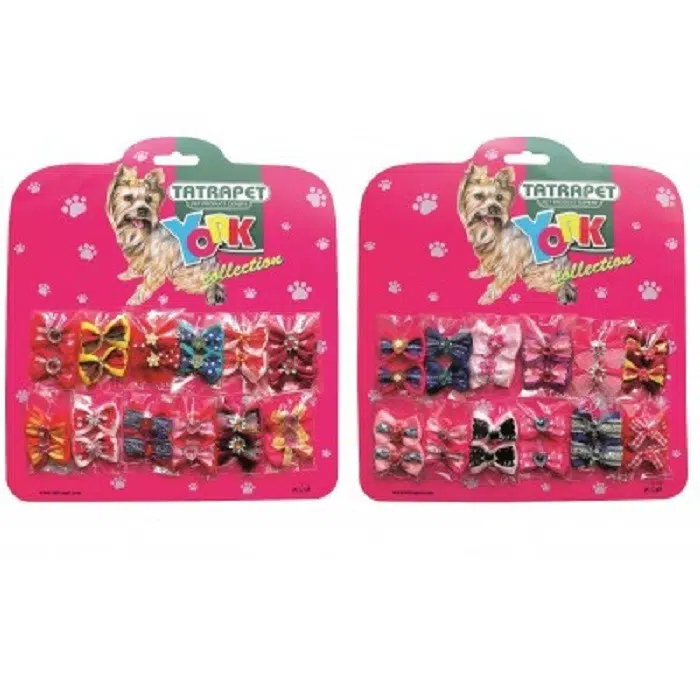 Fundite pentru prinderea coditelor cu elastic de cauciuc, confectionate din material textil de diverse culori si modele. Sunt recomandate cainilor de talie mica si medie. Setul contine 2 bucati din fiecare model, avand un total de 24 de fundite.