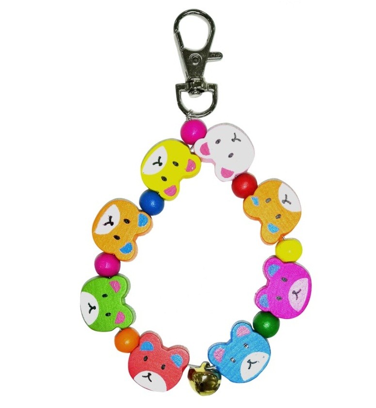 Jucarie confectionata din lemn si clopotel metalic, pentru atasarea la colivia pasarilor.