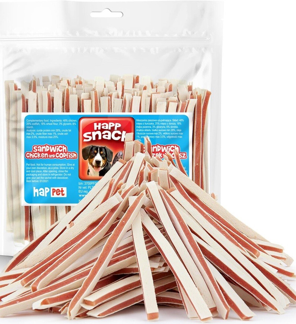Sandwich-urile din carne de pui si cod sunt un aliment complementar pentru toate rasele de caini, recomandate atat ca recompensa cat si ca aliment. Sunt ambalate in punga cu greutatea de 500g.