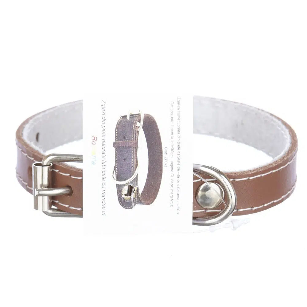 Zgarda confectionata din piele naturala de vita, in diverse culori, avand latimea de 1,4cm si lungimea de 30cm. Este recomandata pentru pisici si caini de talie mica (bichon, chihuahua, yorkshire, etc).