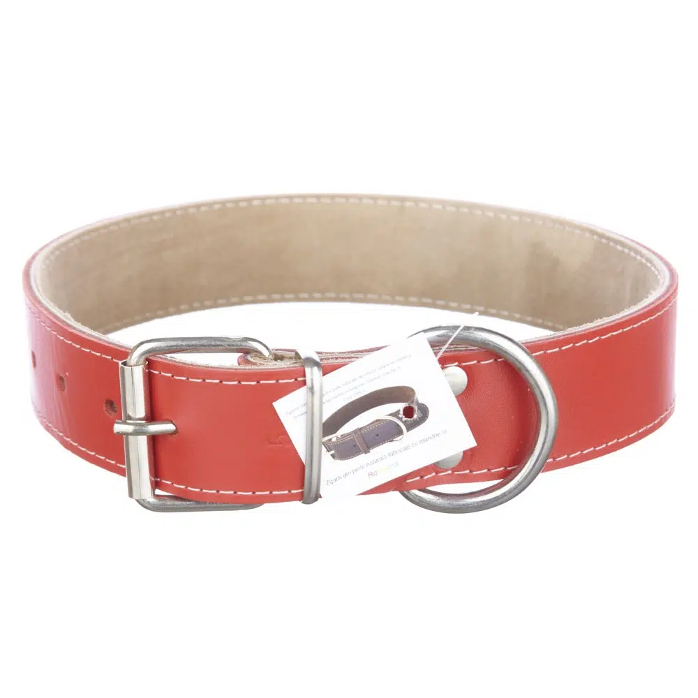 Zgarda confectionata din piele naturala de vita, in diverse culori, avand latimea de 4cm si lungimea de 65cm. Este recomandata pentru caini de talie medie spre mare (doberman, ciobanesc german, labrador, boxer, rottweiler, amstaff, etc).