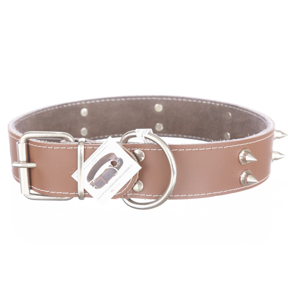 Zgarda confectionata din piele naturala de vita, personalizata cu 2 randuri de colti metalici, in diverse culori. Avand latimea de 4cm si lungimea de 65cm, este recomandata pentru caini de talie medie spre mare (doberman, ciobanesc german, labrador, boxer, rottweiler, amstaff, etc).